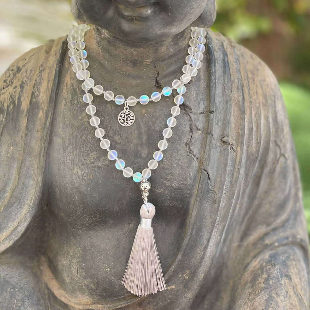 El número 108 es un número sagrado en el hinduismo y el budismo y representa las 108 pasiones que nos impiden alcanzar la iluminación. El collar Mala con cuentas de cristal austriaco puede ayudarlo a conectarse más profundamente con su práctica espiritual y profundizar su meditación.