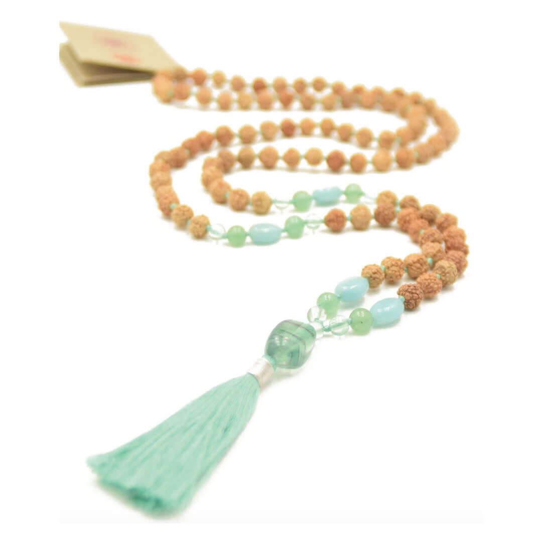 Collar Mala - Green Spirit Mala - Cuentas de Rudraksha combinadas con la energía de las piedras preciosas de Amazonita y Aventurina